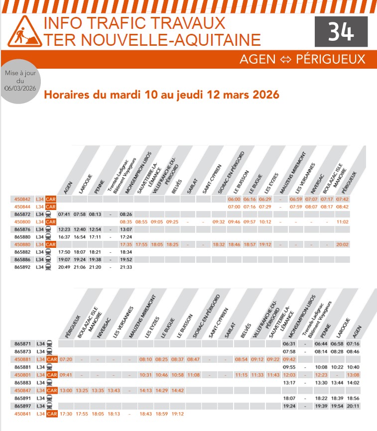 Pas d'effusion de joie à avoir même si on ne peut que se satisfaire de voir les installations d'une gare régénérée, ça va dans le bon sens. Les travaux auront lieu de la mi-septembre à quasiment la fin octobre. Ils seront suivis d'un remplacement de traverses entre Monsempron-Libos et Sauveterre-la-Lémance ou Villefranche-du-Périgord (je n'ai plus le KM exact en tête lorsque j'écris ces ligne) du 13 octobre au 21 novembre. Travaux "habituels" qui permettent de maintenir le 80 km/h sur la section de ligne.